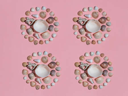 Different seashells on a bright pink background , the concept of holidays by the sea. Background with shells, round frame, copy space in the center