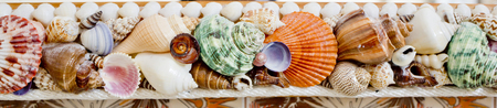 Panorama of sea shells on a blue background