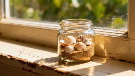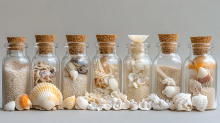 Horizontal photo of a glass bottle with cockle sea shells