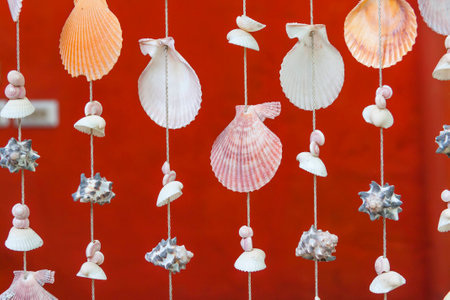Wall decor made of shells. Handmade wind chimes of seashells. Bali, Indonesia