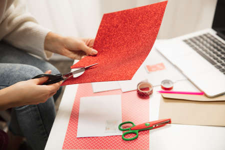 Close up female hands making greeting card for New Year and Christmas 2021 for friends or family, scrap booking, DIY. Writing a letter with best wishes, design her homemade card. Holidays, celebration.