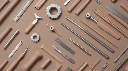 A flat lay of an array of tools on a smooth brown surface, showcasing various instruments ideal for crafting, DIY projects, and professional work.
