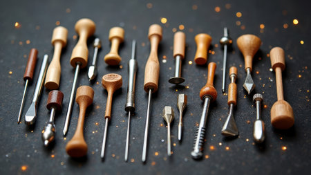 Assorted woodworking tools on dark surface with sparkling background. That the image is generated using AI.