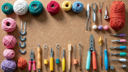 Colorful yarn balls and crochet tools organized on corkboard background. That the image is generated using AI.