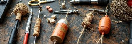 Rustic fishing tackle set with corks, hooks, and twine on weathered surface.