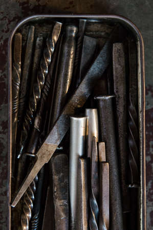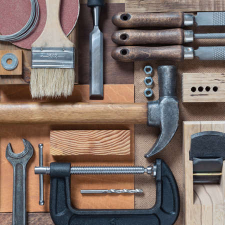 A flat lay, top-down view of various vintage workshop tools arranged on a dark, textured surface. The collection includes chisels, paintbrushes, wrenches, gears, and other old, used metal and wooden tools. The image evokes craftsmanship, manual labor, and a rustic, industrial aesthetic.