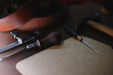 border of various tools for sewing leather goods. Handmade wallets, belts, bags.