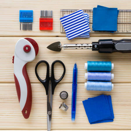 Items for patchwork. Pieces of fabric and sewing accessories on a wooden background.