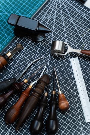 Top view materials and instruments on cutting mat for chopping measurement leatherwork details