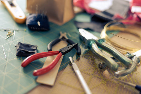 Selective focus of Many DIY equipment on a green cutting mat and copy space for do it yourself concept