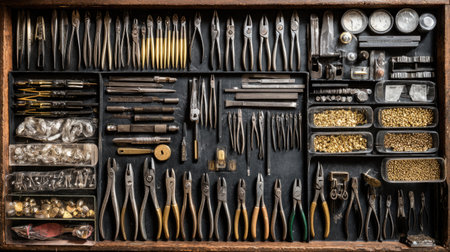 Organized layout of pliers, saw blades, and calipers for precision jewelry work