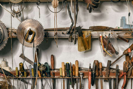 Variety of old vintage and modern household hand tools on a garage shelves in a DIY and renovations concept