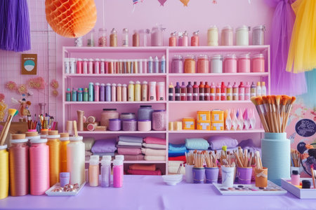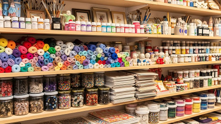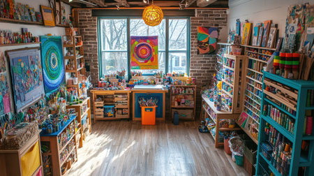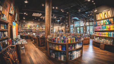 Explore a vibrant art supply store full of colorful materials, including brushes and paints. An inviting atmosphere for artists and creatives alike.