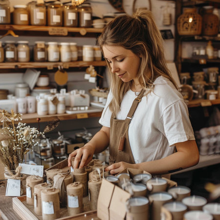 Close-up of an artisan packing handcrafted soap bars in a rustic shop. The scene showcases eco-friendly packaging, wooden textures, and a warm atmosphere, perfect for artisanal and sustainable concepts.