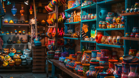 A variety of colorful pottery items on shelves in a traditional market setting. Suitable for concepts related to culture, crafts, and local markets.