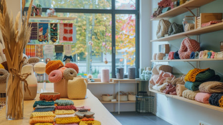 creative space, with baskets of colorful yarn, tools, and finished projects, created with generative ai