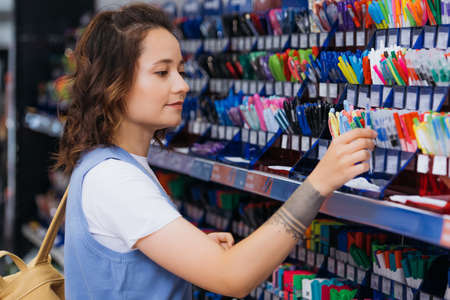 young tattooed woman near rack with multicolored pens in stationery store
