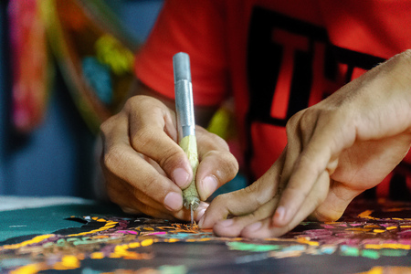 Detail work of crafting flower patterns on vintage wooden surface with brush. That the image is generated using AI.