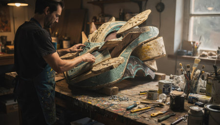 Medium shot focusing on an artist assembling large oversized props on the bench the tools and paints around diffused to emphasize the handcrafted creation.