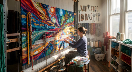 A female textile artist sits at a large vertical loom in her sunlit studio, meticulously weaving a massive and vibrant abstract tapestry. The creative space is filled with colorful spools of yarn, showcasing the dedication and artistry of this traditional craft.