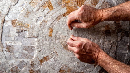 A close-up view of hands skillfully arranging natural materials to create a detailed circular pattern. The image captures the essence of artistry and craftsmanship in action.