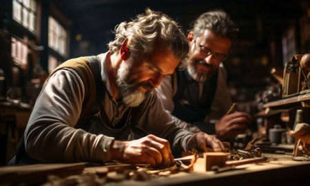 A skilled craftsman focuses on his woodworking project in a dimly lit workshop filled with tools and wood shavings, creating a serene atmosphere of dedication and craftsmanship.