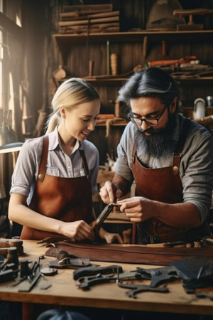 leather craftsmen working making measupenets in patterns at table in workshop studio