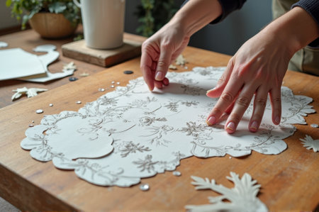 Intricate stencil crafting by female hands on lace doily background. That the image is generated using AI.