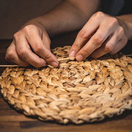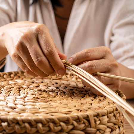 With focused hands and patient skill, an artisan meticulously weaves natural fibers, transforming simple strands into a beautiful, functional piece of art.