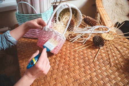 Hands of a craftsman with a brush painting a wicker basket