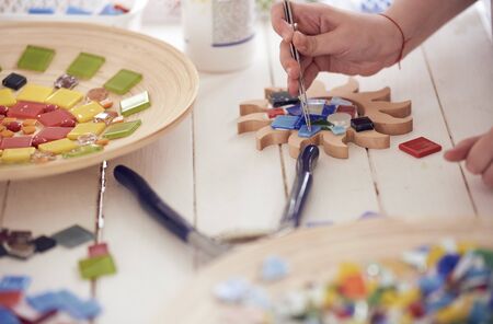 The artist maker mosaic in a wooden harvesting. Female hands closeup collect mosaic of colored stones. Human activity to workplace