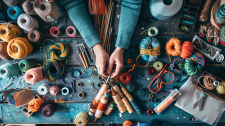 Person is working on a project with a variety of colorful yarns and threads. Concept of creativity and craftsmanship, as the person carefully selects