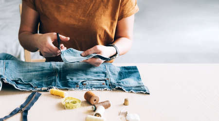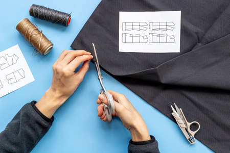 Workplace of seamstress. Hands doing sewing patterns with fabric
