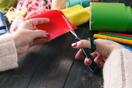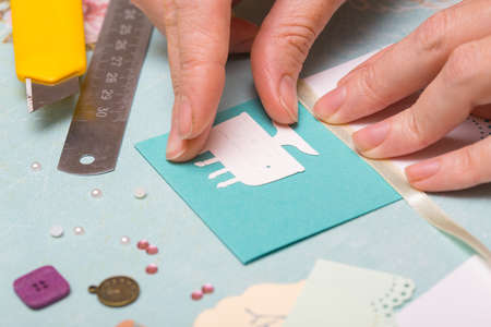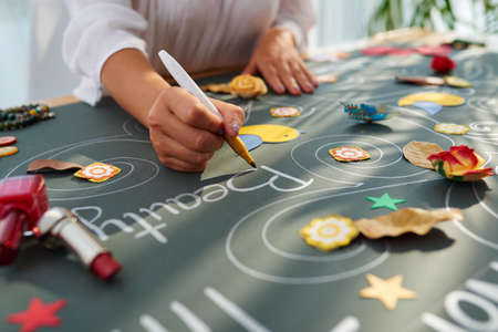 Close up female hands making greeting card for New Year and Christmas 2021 for friends or family, scrap booking, DIY. Writing a letter with best wishes, design her homemade card. Holidays, celebration.