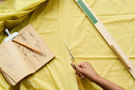 High angle of hand of tailor holding scissors while cutting textile on table while creating new attire for client or seasonal fashion collection