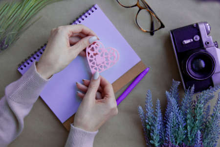 Wooden heart LOVE at woman hands behind notebook on the table and retro camera. Peace - harmony concept. holding Heart shape symbol. Valentines - romantic greeting lifestyle feelings concept