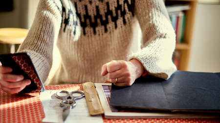 A woman cuts out photos with people in close-up. A girl uses scissors to cut printed photos for an album. A person holds a photo in his hands against the background of other photos.