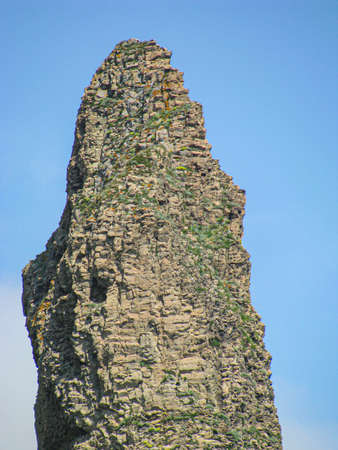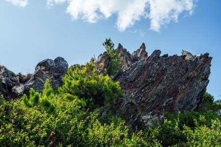 Beautiful big stone with mosses and lichens among rich greenery under blue sky with big cloud. Scenic nature background with big sharpened rock among lush vegetation. Spiky stone among vivid grasses.