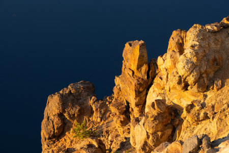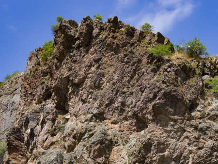 Selective focus. A green tree grows at the top of the cliff. Blue sky, sunny day