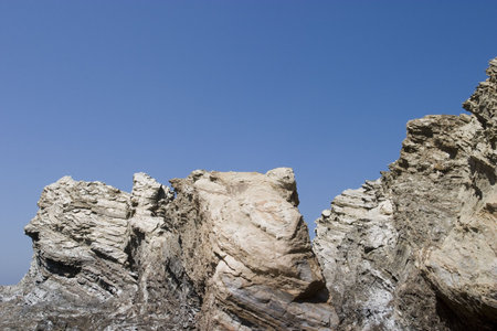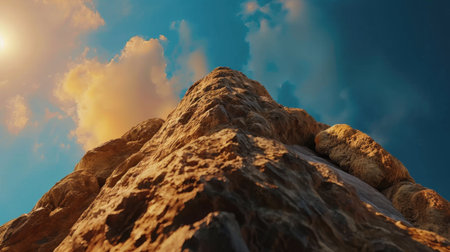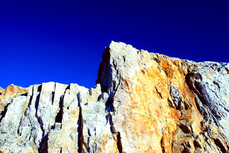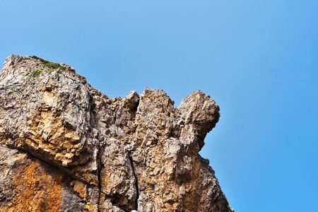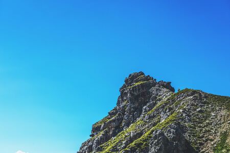 Extreme low angle view of rocky mountain top under a clear blue sky on a pleasant afternoon