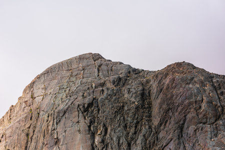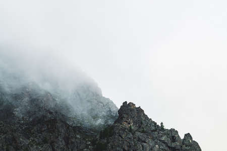 Dramatic bleak fog among giant rocky mountains. Ghostly atmospheric view to big cliff in cloudy sky. Low clouds and beautiful rockies. Minimalist scenery in mysterious place at early foggy morning.