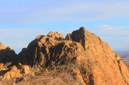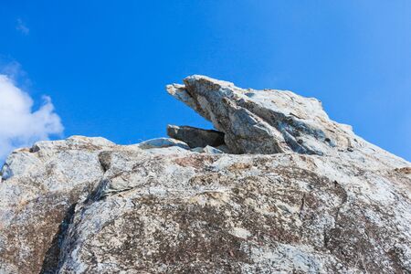 Close up of stones in highlands. Destroyed rock formations in mountainous area on sunny day.