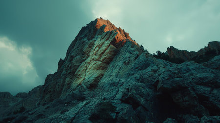 Sharp rocky cliffs rise against a partly cloudy sky in Armenia. A dramatic view of textured stone formations lit by warm sunlight, capturing raw and wild natural beauty