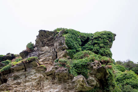 Big mountain cliff under cloudy sky close-up. Beautiful rocky gray textured background with vegetation. Majestic nature.