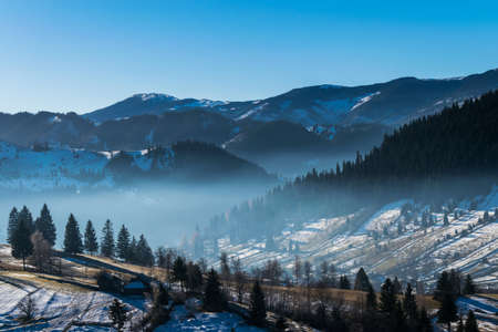Winter village in the Carpathian Mountains among the pine trees and fir trees against a beautiful sky
