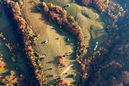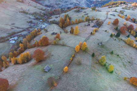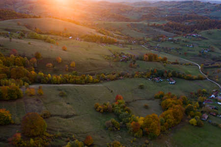 Aerial view of authentic traditional villages from Apuseni area in Romania during autumn sunset