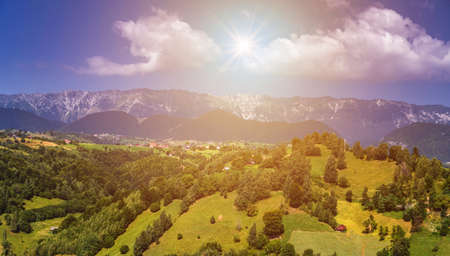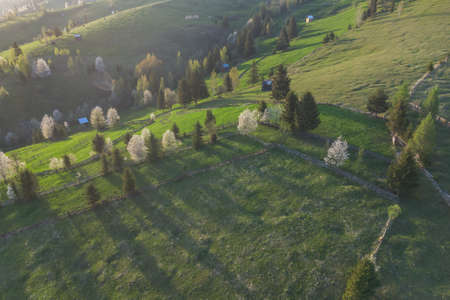Aerial view of endless lush pastures of Transylvania. Beautiful romanian countryside with emerald green fields and meadows. Rural landscape on sunrise.
