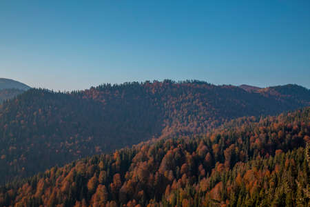 Fall landscape in the mountains. Mountain autumn scene with colorful trees in the forest