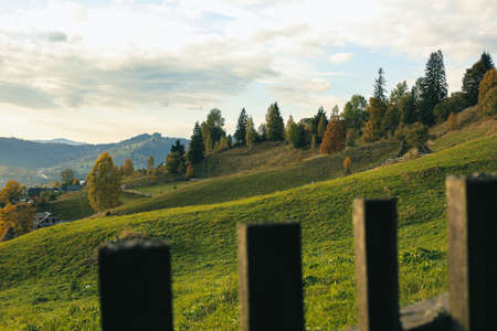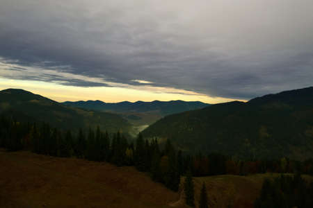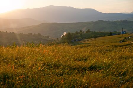 beautiful landscape of mountains covered with trees and fields at dawn. Hills hit the sun.