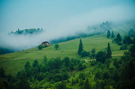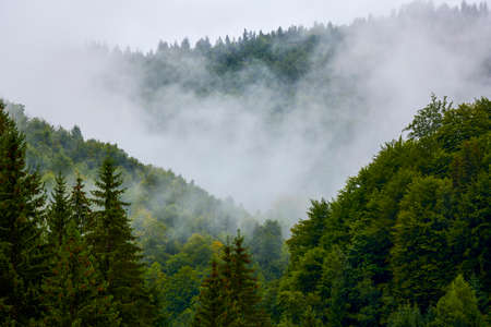 View of majestic mountain forest. Gorgeous foggy hill with colorful coniferous trees. Concept of nature.